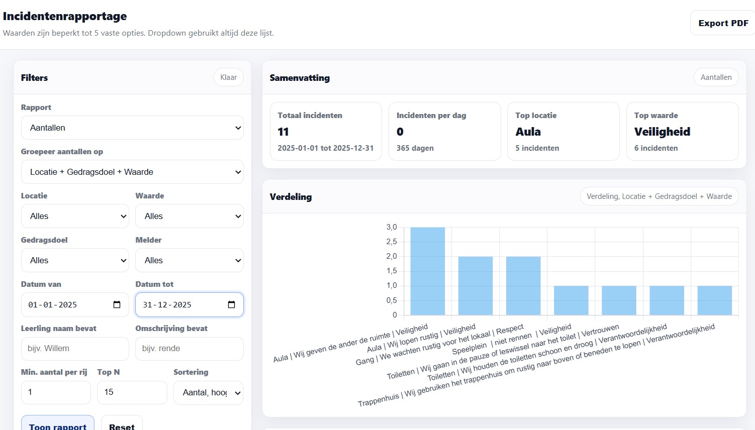 Naast de flexibele incidentregistratie beschikt de applicatie over uitgebreide rapportagemogelijkheden. U kunt kiezen uit standaardrapportages, maar het is ook mogelijk om rapportages naar eigen inzicht aan te passen. Zo sluit de registratie en analyse van incidenten altijd aan op de wensen van uw school.